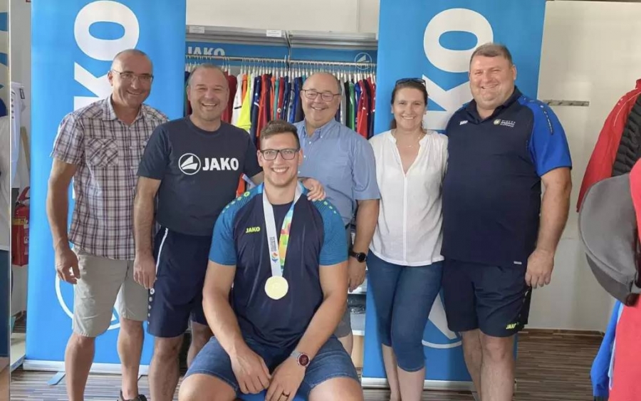 V sredo, 20. julija, smo lahko iz ZDA spremljali fantastično športno predstavo, saj je naš slovenski as Kristjan Čeh z 71,13 metra za skoraj 2 metra pometel s konkurenco. Ne le to, 23-letni Čeh je postavil tudi rekord svetovnih prvenstev, Slovenija pa je tako dobila novega svetovnega prvaka v atletiki - in to po 13 letih! Kristjana Čeha so s ponosom in občudovanjem pozdravili tudi v Lenartu, na sedežu JAKO Slovenija - VITA ŠPORT, d. o. o., s katerim svetovni prvak v metu diska poslovno sodeluje. Sprejema sta se udeležila župan mag. Janez Kramberger in podžupan Franci Ornik.