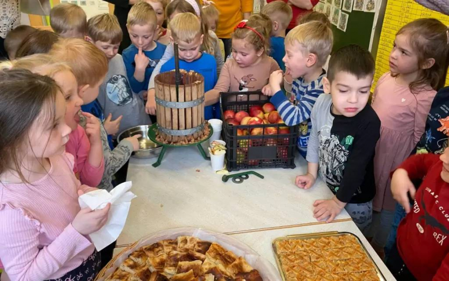 Danes je otroke v Vrtcu Lenart obiskal Janko Sekol iz Sadjarskega društva Slovenske gorice in jih podučil o vzgoji sadnega drevja, pridelavi ter predelavi jabolk, nato pa so skupaj izdelali svež jabolčni sok. Ob soku se je skozi luknjice majhne preše pocedila tudi jabolčna kaša, v katero so otroci brez obotavljanja pomočili prste in s širokimi nasmehi poskusili ustvarjeno. Posladkali so se tudi z domačim jabolčnim zavitkom in jabolčno pito, ki so ju prinesle gospodinje iz Društva kmečkih žena Voličina. Preden so se zbrani odšli vsak svojo pot so jim otroci odpeli še naučeno pesmico o jabolkih.